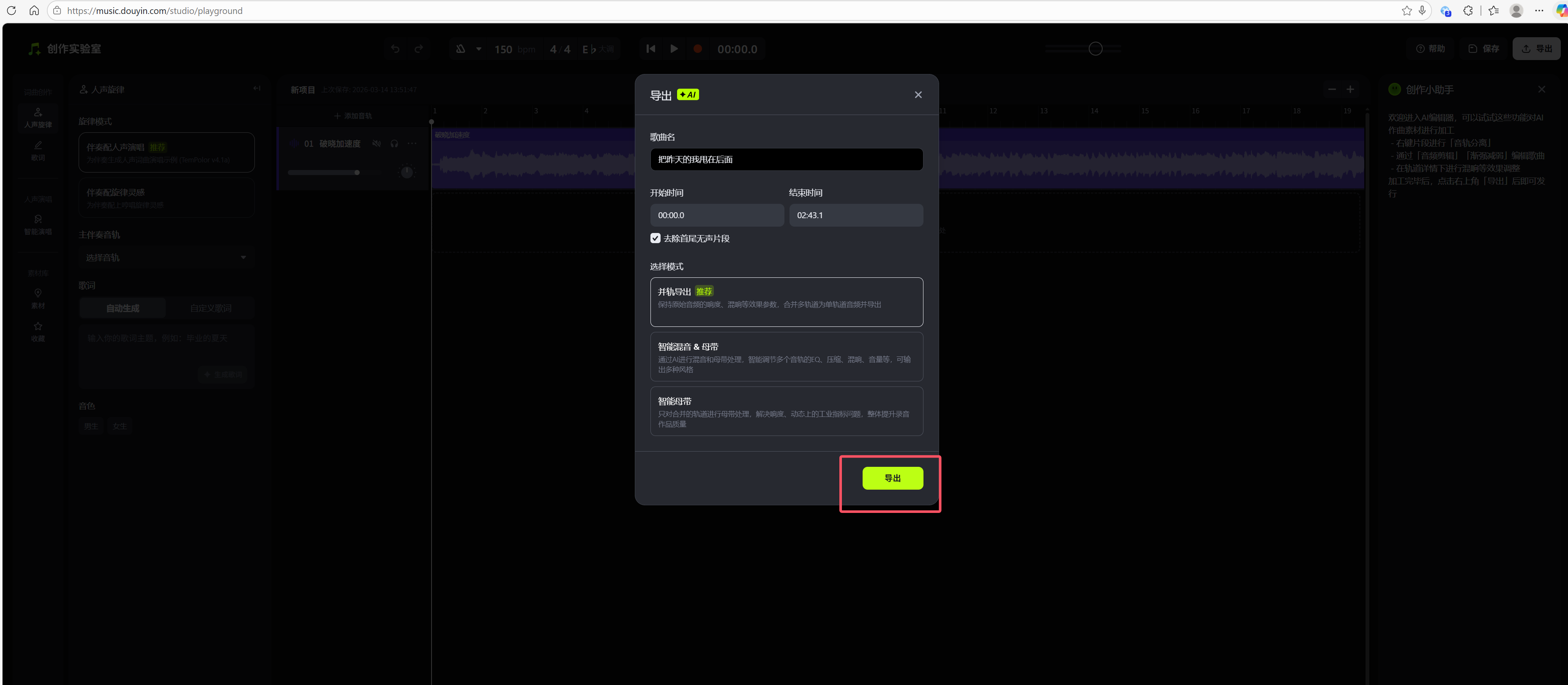 点击右上角“导出”按钮,然后加上歌曲名字。