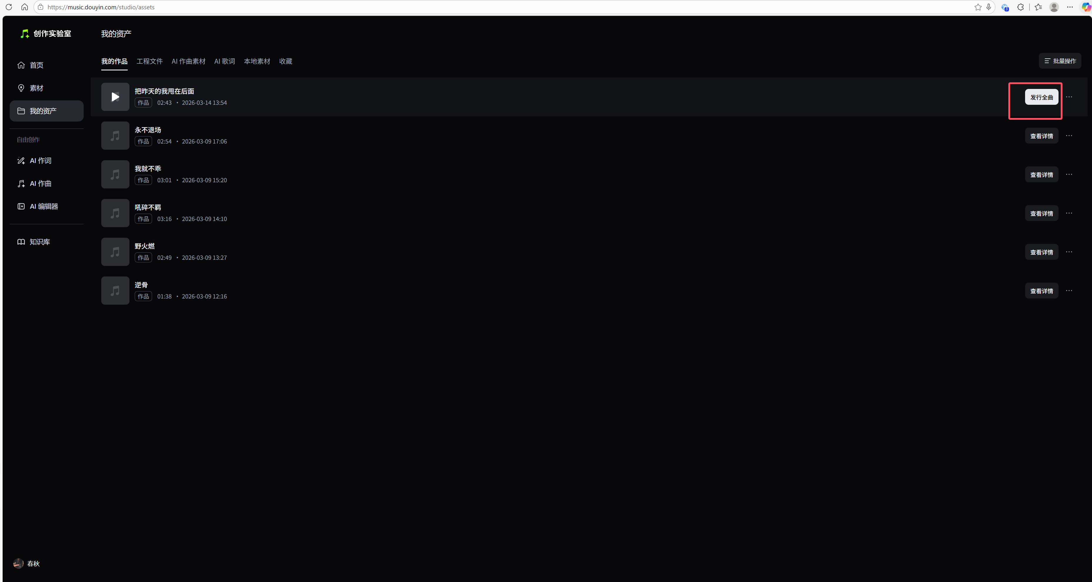 导出成功后,就到了“我的资产”页面。然后点“发行全曲”即可发行!