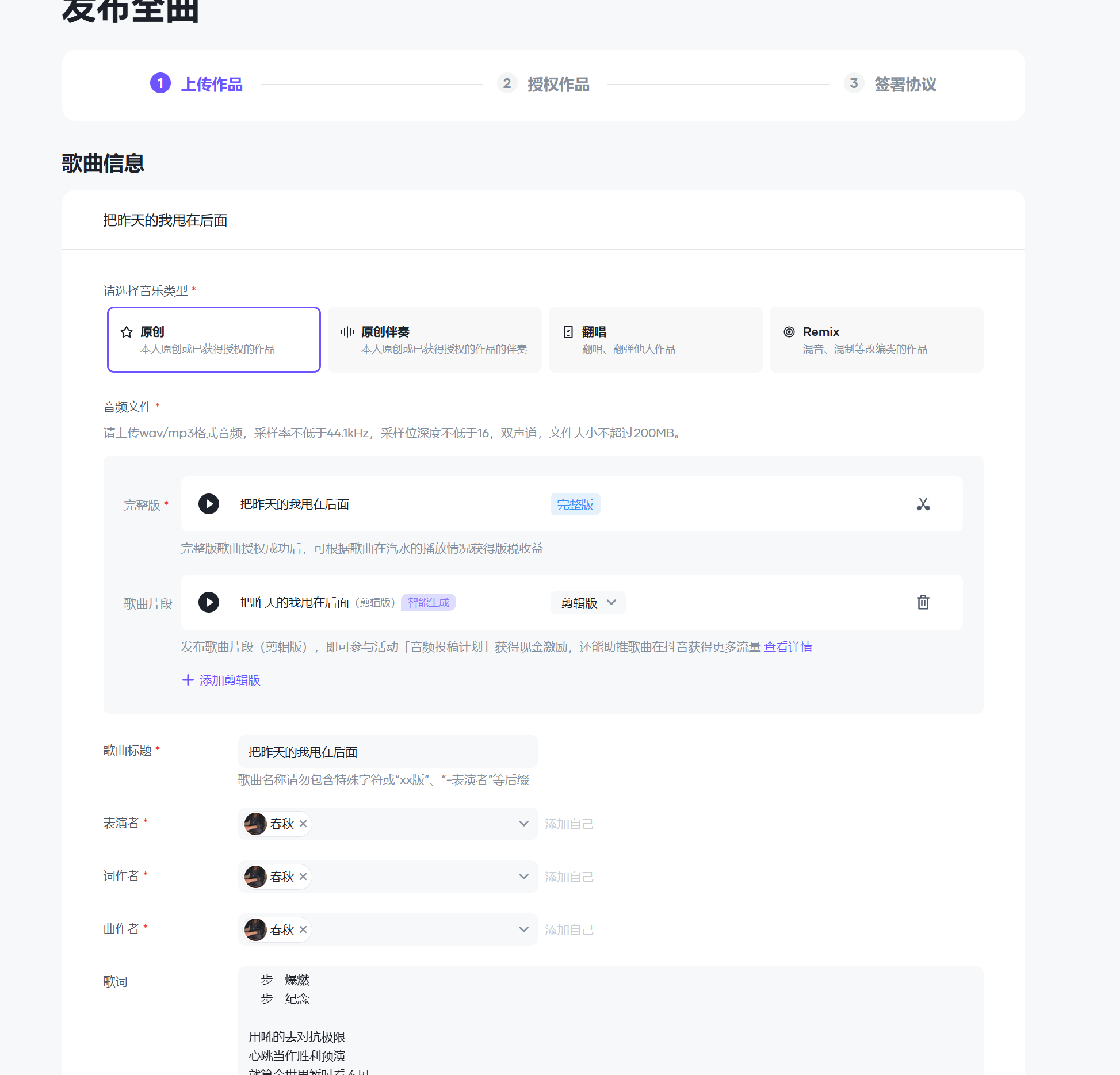 输入必填信息,其实大部分都自动填写好了,只需要加上歌词和封面。