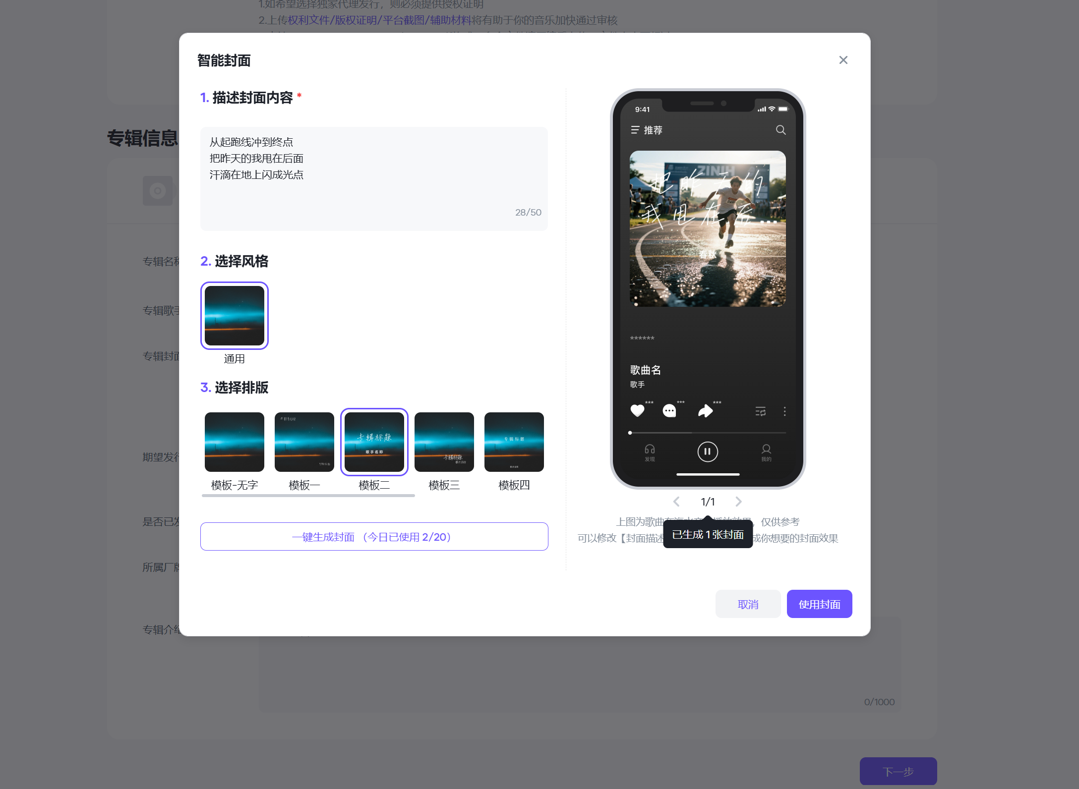 封面可以选智能封面,输入几句歌词来自动生成:
